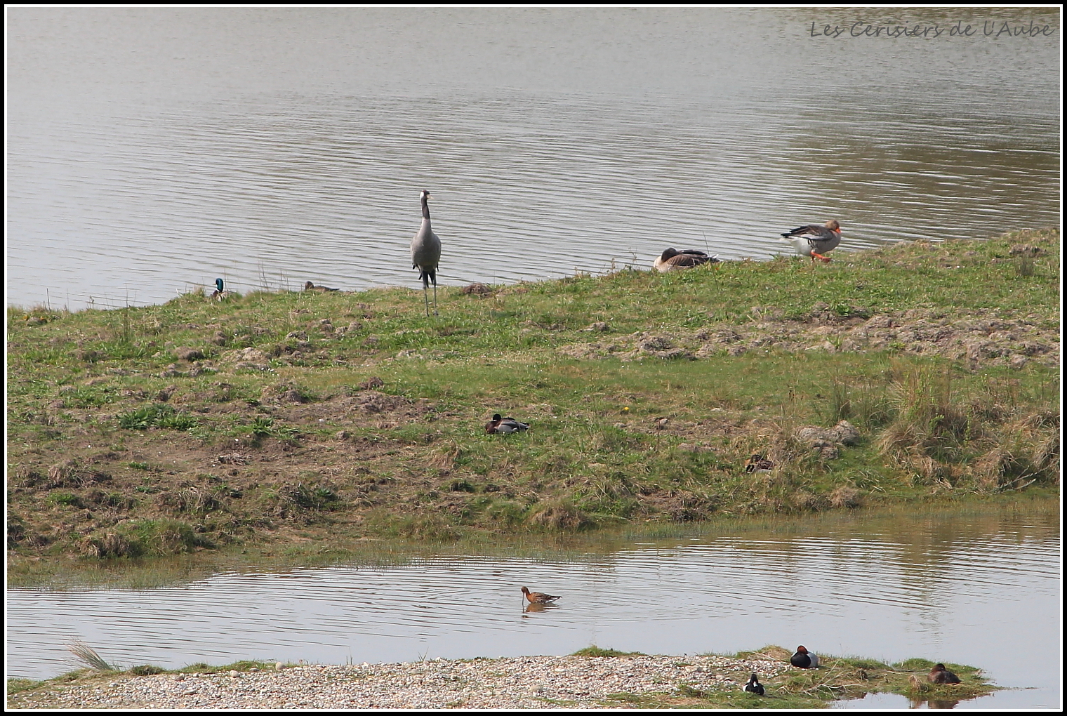 Une grue, des oies cendrées, des canards, et au centre, dans l'eau, une barge à queue noire, qui préfère s'isoler du groupe précédemment cité !